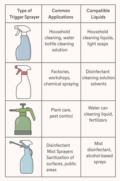На рынке доступно несколько типов триггерных распылителей, предназначенных для конкретных целей. Некоторые из них представляют собой промышленные распылители, способные выдерживать химическую стойкость, в то время как другие представляют собой бытовые распылители, предназначенные для пластиковых чистящих средств и распылителей дезинфицирующего тумана. Регулируемые форсунки являются общей функцией, обеспечивающей контроль над производительностью. Напротив, обычные распылители не имеют такого разнообразия; обычно они имеют базовую конструкцию, обеспечивающую один тип распыления. Распознавание типов триггерных распылителей помогает пользователям выбрать наиболее подходящий вариант для использования дезинфицирующего средства с туманом, опрыскивания сада или нанесения чистящей жидкости для банок с водой.